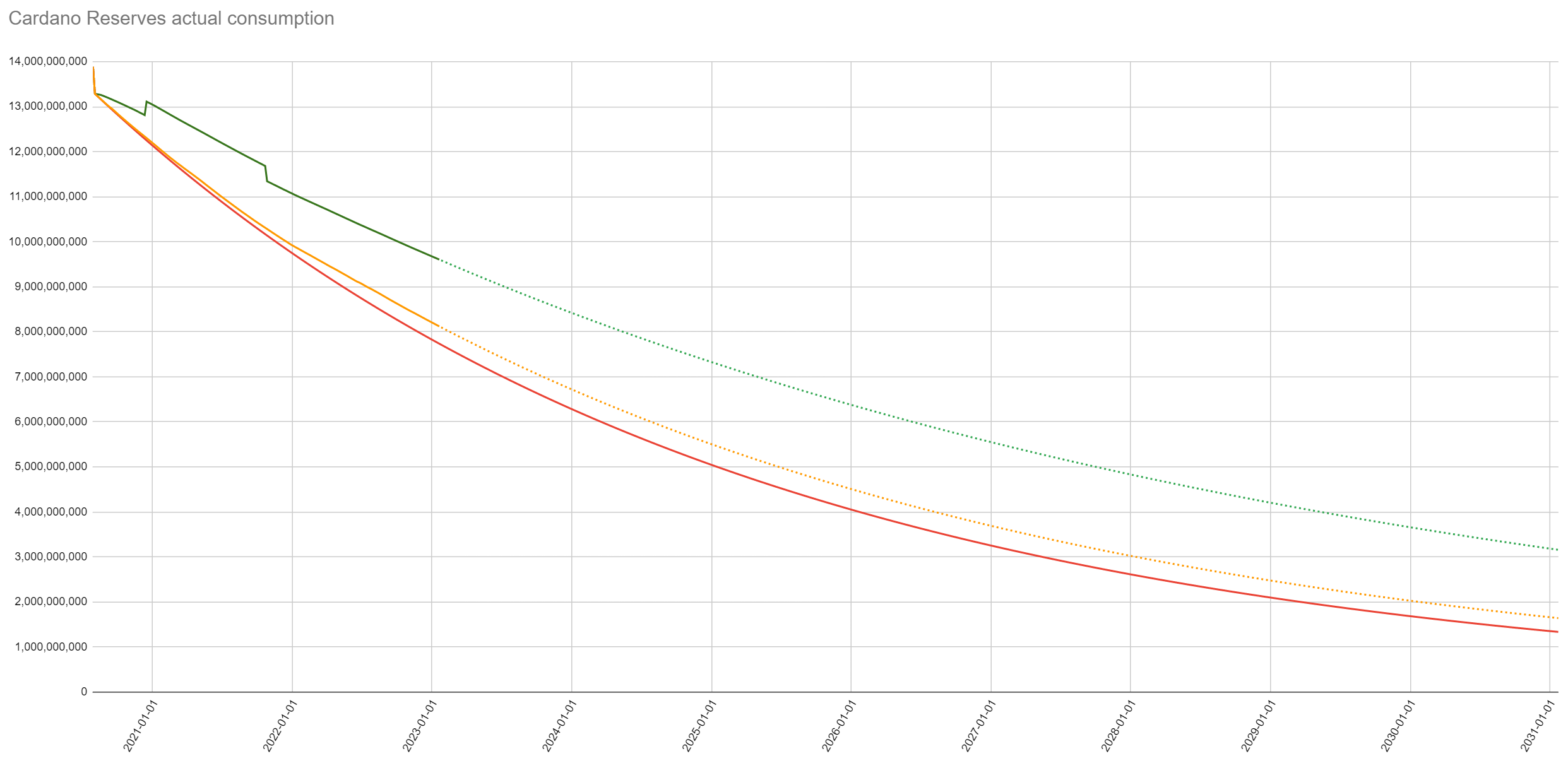 - Yellow = ADA in reserves account for actual blocks produced (Eta) and missing pledge. This is the track the reserves is expected to follow after the inclusion of this CIP.