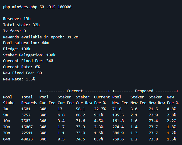 Definitions: Pool Stake - Total stake delegated to pool. Total Rewards - Total rewards generated by the pool in one epoch. Pool Cur Fee - The total amount of fees taken by the pool with current parameters. Staker Cur Fee - The amount of fees paid by a staker who delegates 100k ADA with current parameters. Staker Cur Rew - The amount of rewards received by a staker who delegates 100k ADA with current parameters. Current Fee % - The percentage of rewards taken by the pool as fees with current parameters. Pool New Fee - The total amount of fees taken by the pool with proposed parameters. Staker New Fee - The amount of fees paid by a staker who delegates 100k ADA with proposed parameters. Staker New Rew - The amount of rewards received by a staker who delegates 100k ADA with proposed parameters. New Fee % - The percentage of rewards taken by the pool as fees with proposed parameters. Note: All amounts other than %s are in ADA.